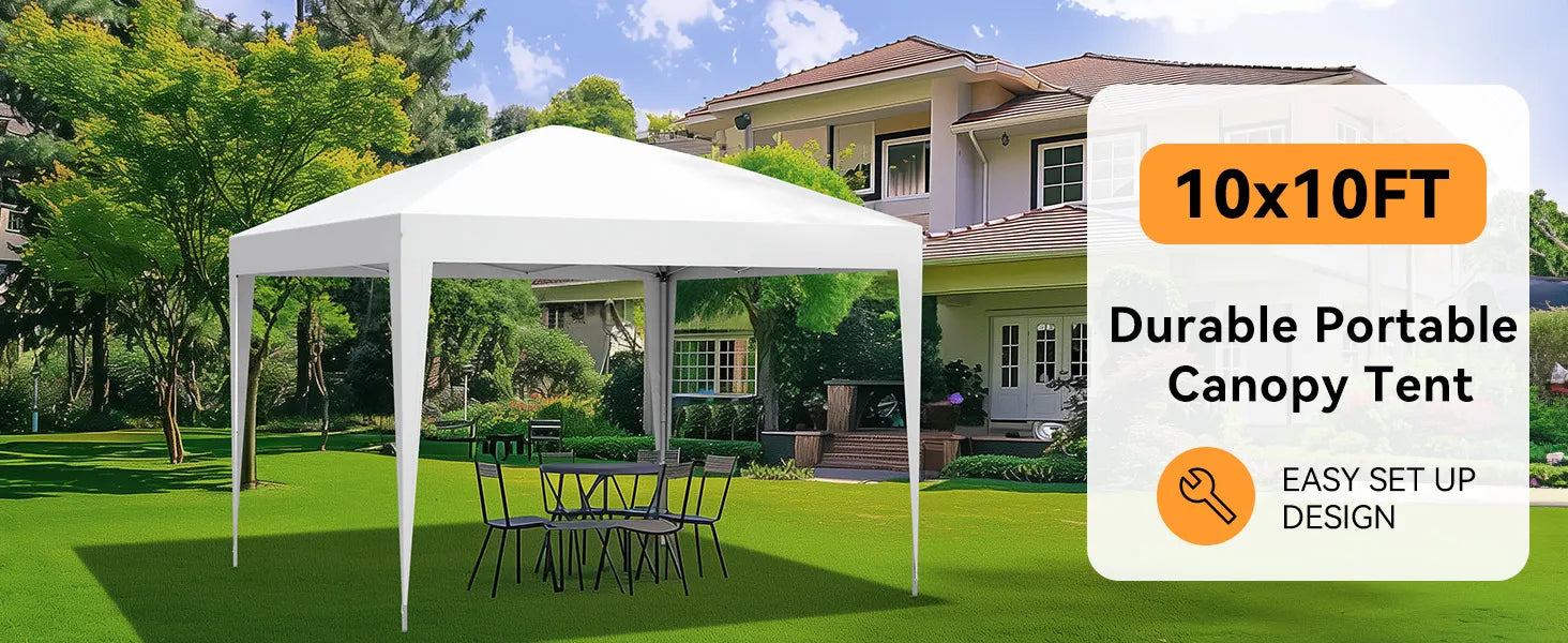 FUNG YARD 10x10 ft Canopy Tent adopts a pop-up foldable design for outdoor instant sunshade, provides 100 square feet of cooling shade, big enough for about 6-8 people to sit under.